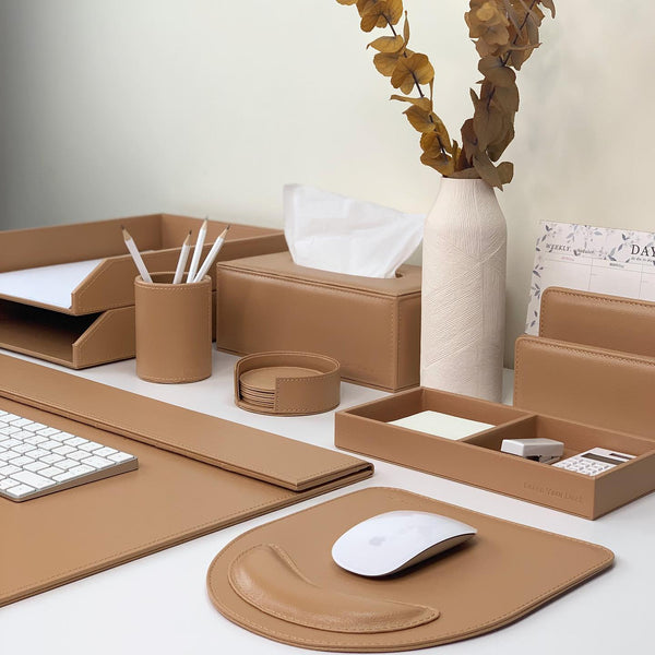 Desk Set (3 pcs) + File Trays (2 pcs) + Tissue Box + Desk Pad + Mouse Pad + Mirror + Coaster (4 pcs) + White Board + Portfolio Folder